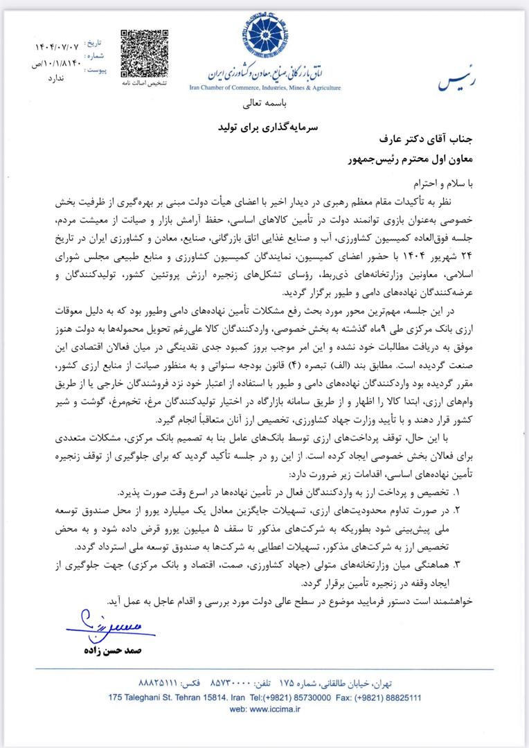 به گزارش آوندا نیوز در حالیکه دکتر محمدرضا عارف، معاون اول رئیس جمهور در پی تاکید مقام معظم رهبری بر صیانت از سفره مردم و تامین بهینه کالاهای اساسی در حال فراهم نمودن نقشه راه و تیم عملیاتی ویژه برای این موضوع حیاتی است، صمد حسن زاده، رئیس اتاق بازرگانی ایران در نامه ای به وی با اشاره به چالشهای زنجیره ارزش تولید پروتئین کشور معوقات ارزی 9 ماهه بانک مرکزی به تجار را عامل مهم کمبود جدی نقدینگی در حوزه تامین نهاده های دام و طیور دانست.