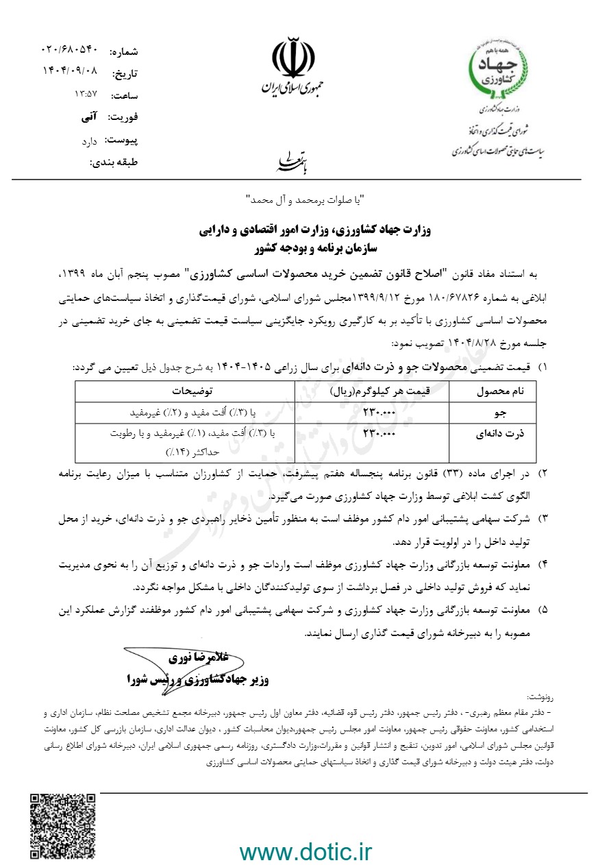 به گزارش آوندا نیوز وزیر جهاد کشاورزی در این ابلاغیه به عنوان رئیس شورای قیمت گذاری و اتخاذ سیاستهای حمایتی محصولات اساسی کشاورزی اقدام به افزایش 9.500 تومانی نرخ تضمینی ذرت و جو نسبت به سال گذشته نمود.