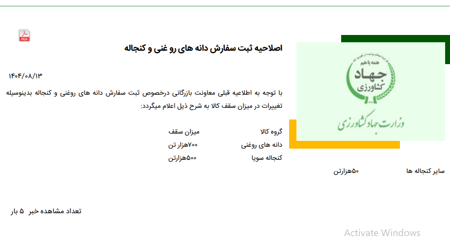 معاونت بازرگانی وزارت جهاد کشاورزی 10 و 13 آبان ماه در اطلاعیه هایی میزان سقف ثبت سفارش دانه های روغنی را ابتدا 400 تعیین نموده و سپس به 700 هزار تن افزایش داد و به همین ترتیب سقف ثبت سفارش کنجاله را از 300 به 500 هزار تن افزایش داد؛ این اقدام هر چند پاسخی بر پیگیری های متعدد اتحادیه آوندا و نتیجه تعامل و همکاری تنگاتنگ دکتر فتحی، معاون بازرگانی وزارت جهاد کشاورزی با تشکلها و بخش خصوصی در پیشگیری از وقوع بحران کمبود به ویژه در کنجاله سویا است، اما به نظر میرسد با شواهد و قراین موجود در بازار جهانی و پیش بینی مصارف و لزوم تنطیم بازار مرغ و تخم مرغ، هنوز هم این میزان بسیار ناکافی و نگران کننده است.