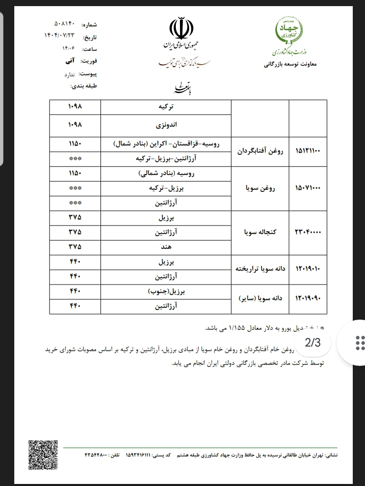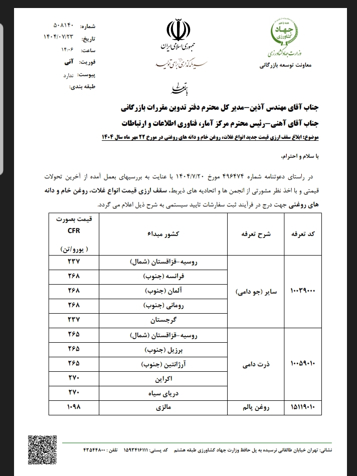 اختصاصی/ با اعلام معاونت توسعه بازرگانی وزارت جهاد کشاورزی آخرین سقف قیمت ارزی غلات، دانه های روغنی و نهاده های دام و طیور جهت درج در فرایند سیستمی ثبت سفارشها اعلام شد.