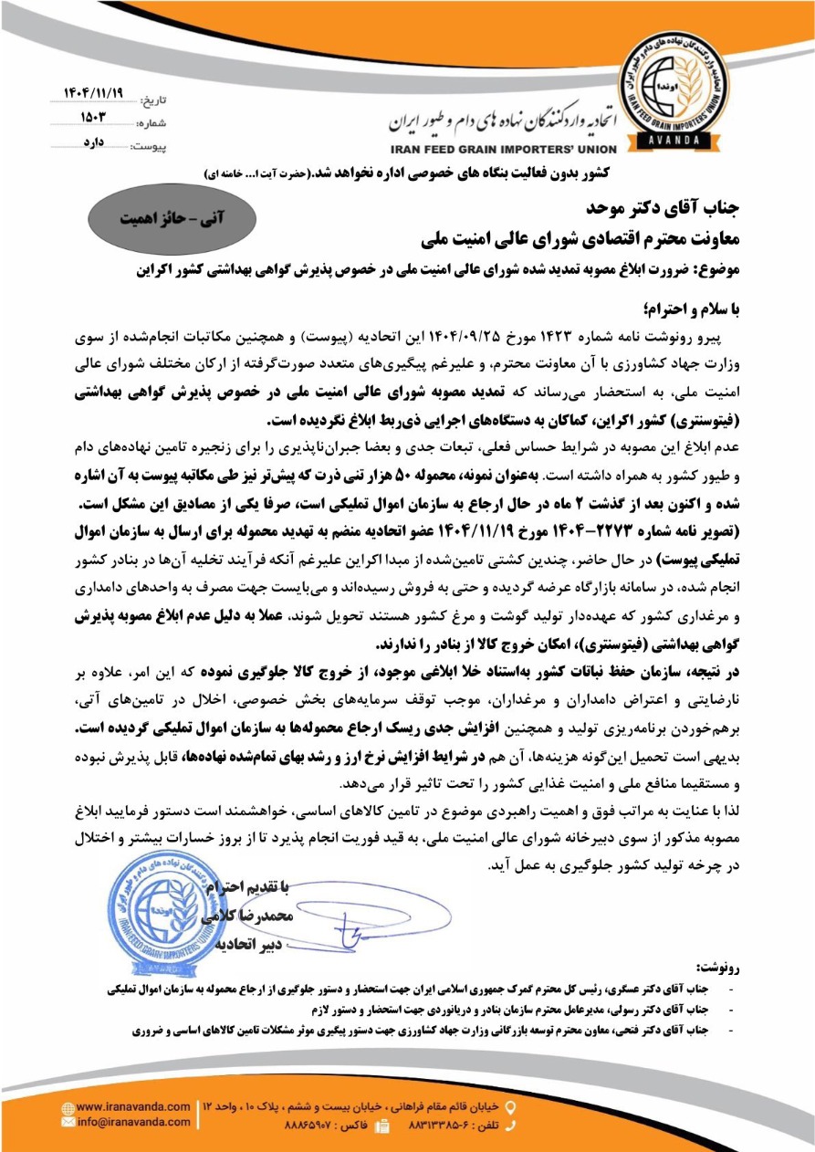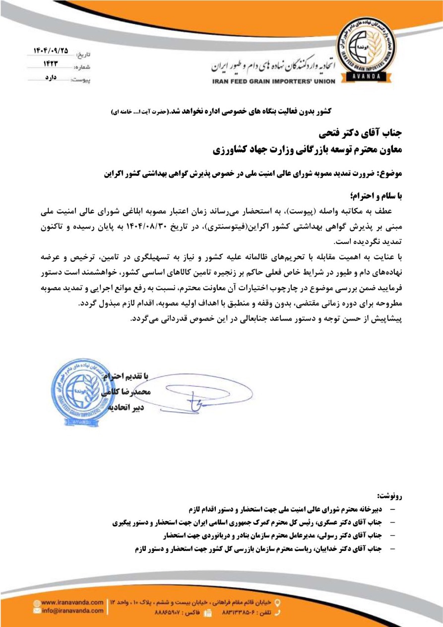بر این اساس بیش از دو ماه است که نامه نگاری و پیگیری های متعدد از سوی شرکتهای وارد کننده فوق و همچنین اتحادیه آوندا به عنوان تشکل و نماینده تامین کنندگان نهاده با شورای عالی سران قوا، شورای عالی امنیت ملی همچنان بدون پاسخ مانده و تلاشها و نامه نگاریهای وزارت جهاد کشاورزی نیز تا کنون منتج به خروجی موثر نگردیده است و علیرغم نیاز کشور به نهادههای اولیه تولید پروتئین و ضرورت رفع موانع وارداتی، تاکنون تمدید و ابلاغ مجدد آن صورت نپذیرفته است.