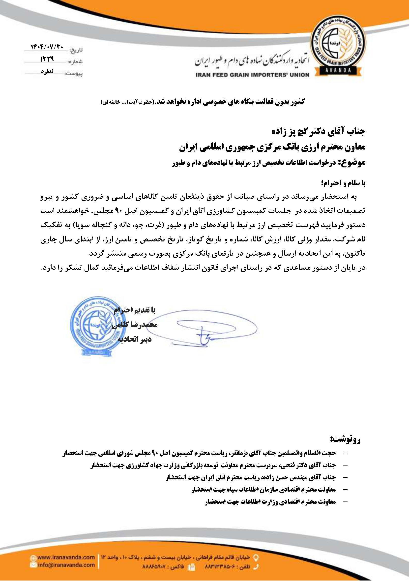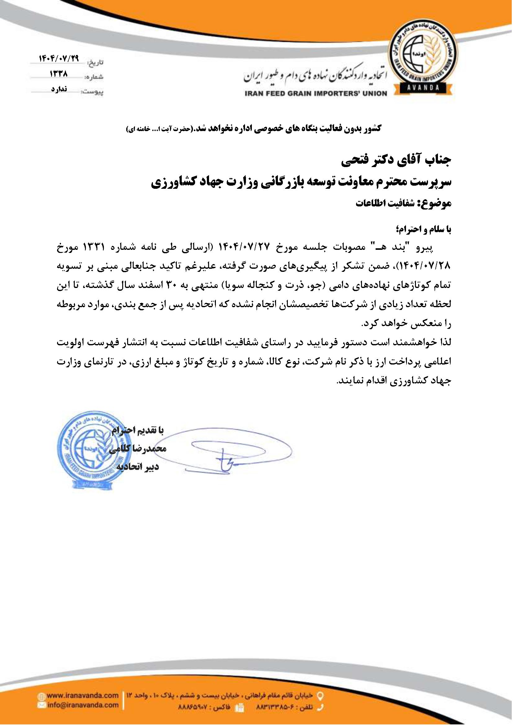 نامه درخواست شفافیت از وزارت جهاد کشاورزی: