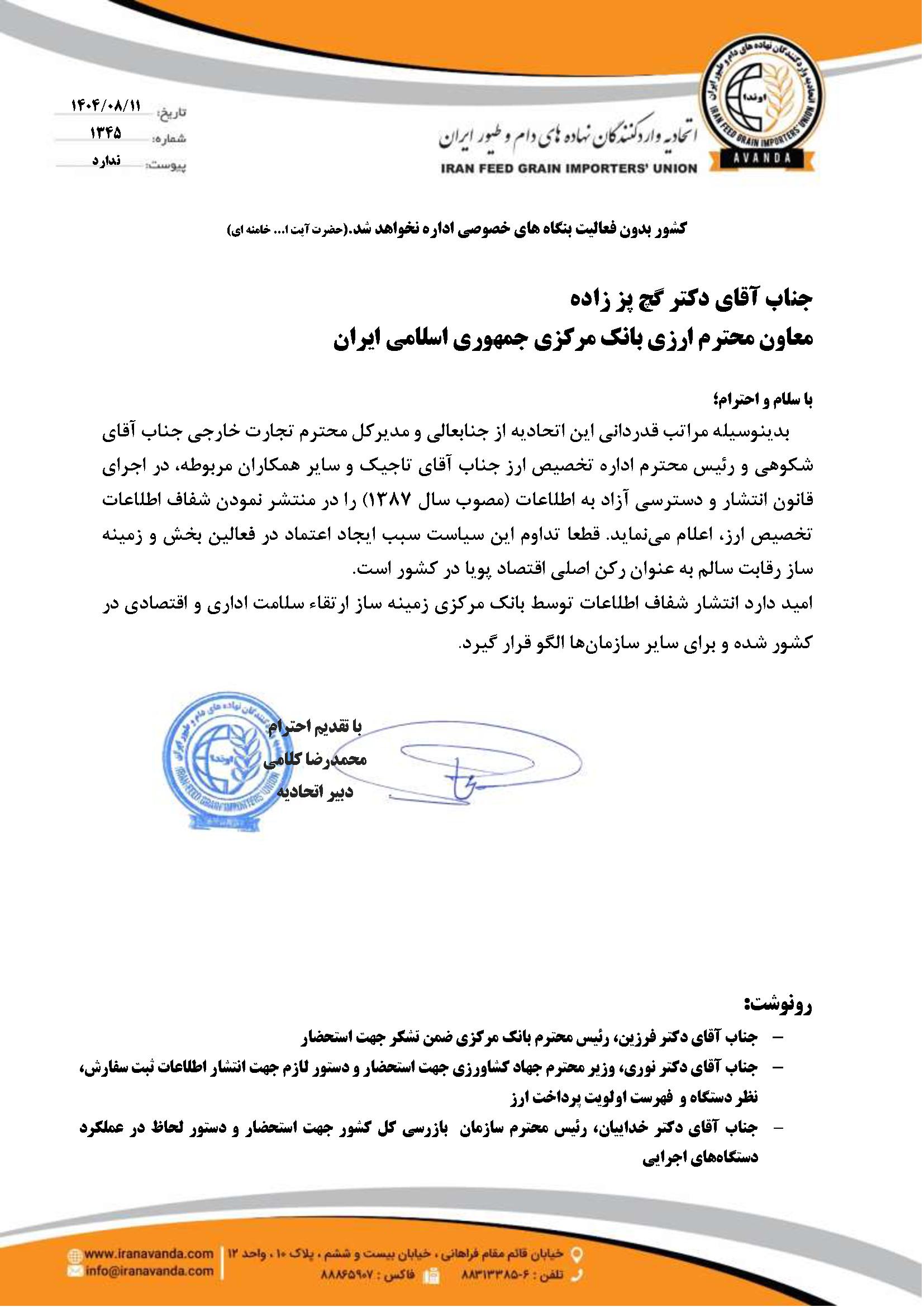 نامه درخواست شفافیت از بانک مرکزی: